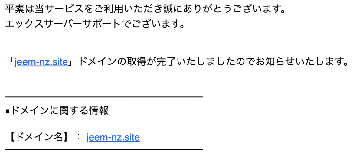 無事に2つ目のドメインを取得したら、【XServerドメイン】独自ドメイン永久無料特典取得完了のお知らせメールが来ます。