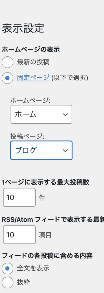• 「ホームページの表示」 → 「固定ページ」にチェック