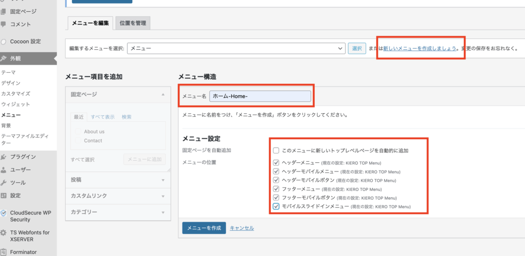 管理画面>[外観]>[メニュー] >[新しいメニューを作成しましょう]