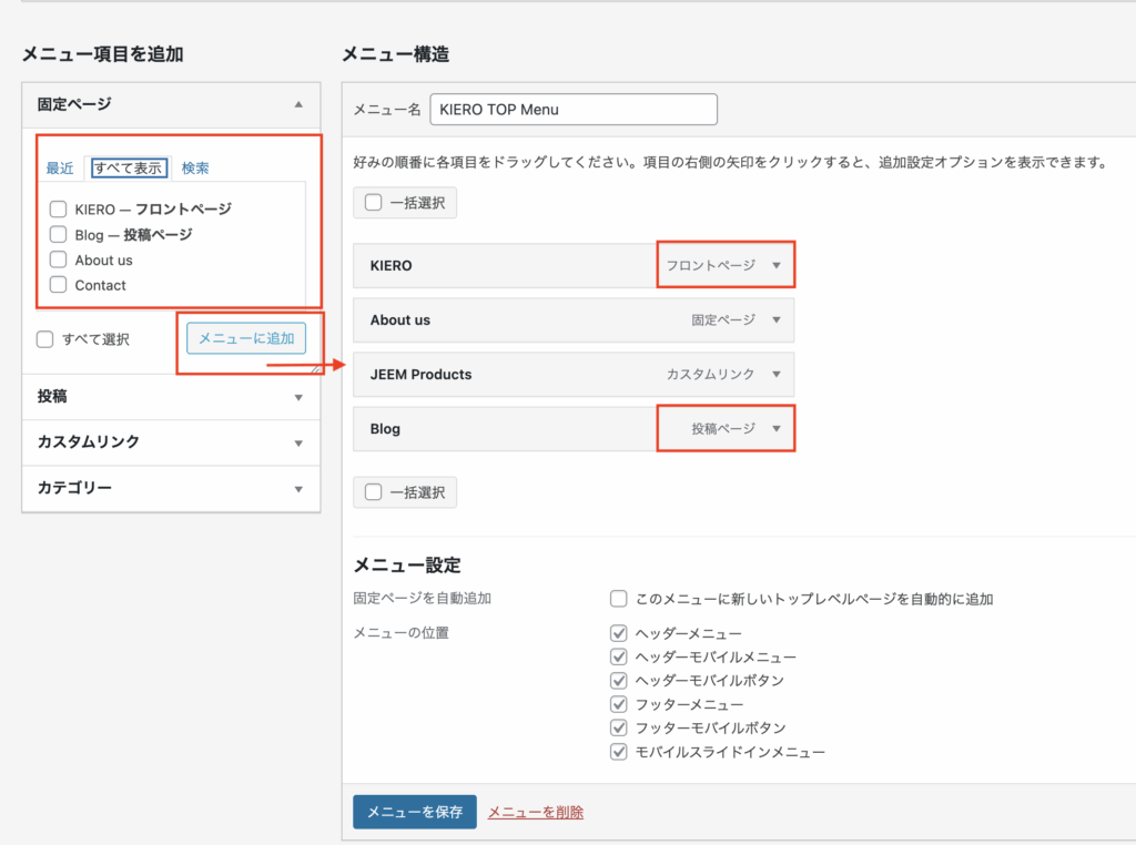 メニュー項目から、表示させるメニューを選び[メニューに追加]