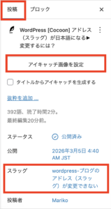 WordPress [Cocoon] アドレス(スラッグ)やアイキャッチ画像設定が見当たらない