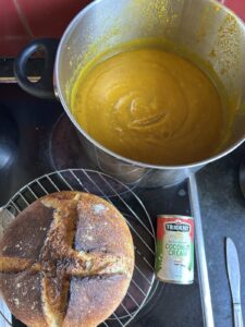 まず昼食には、手作りのパンプキンスープとサワードゥブレッドをご用意。