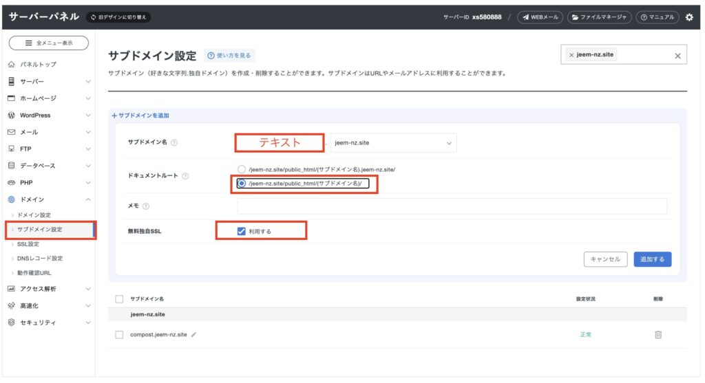 - ブログ(私の場合はXServer)でサブアカウント(ドメイン)を作る
